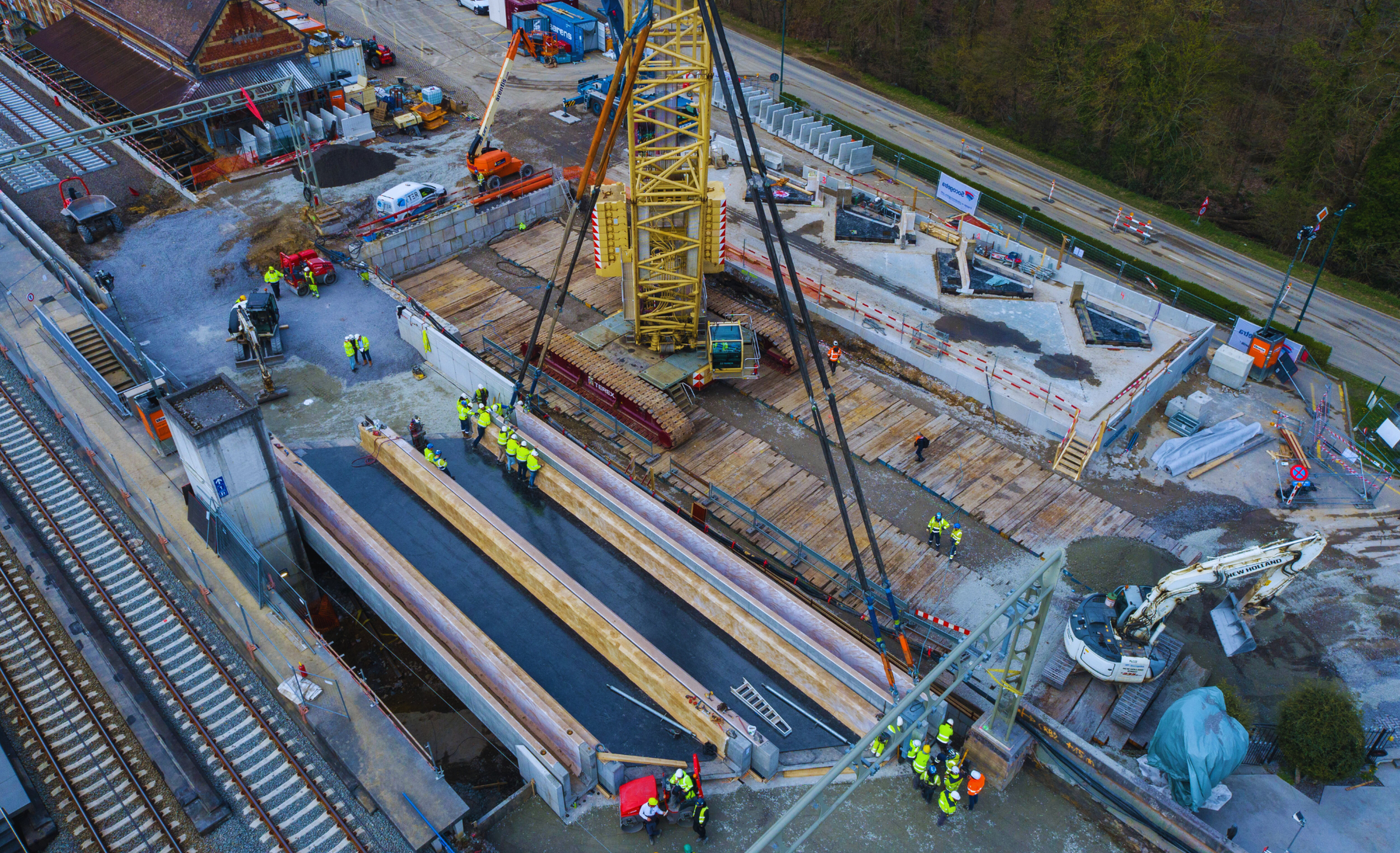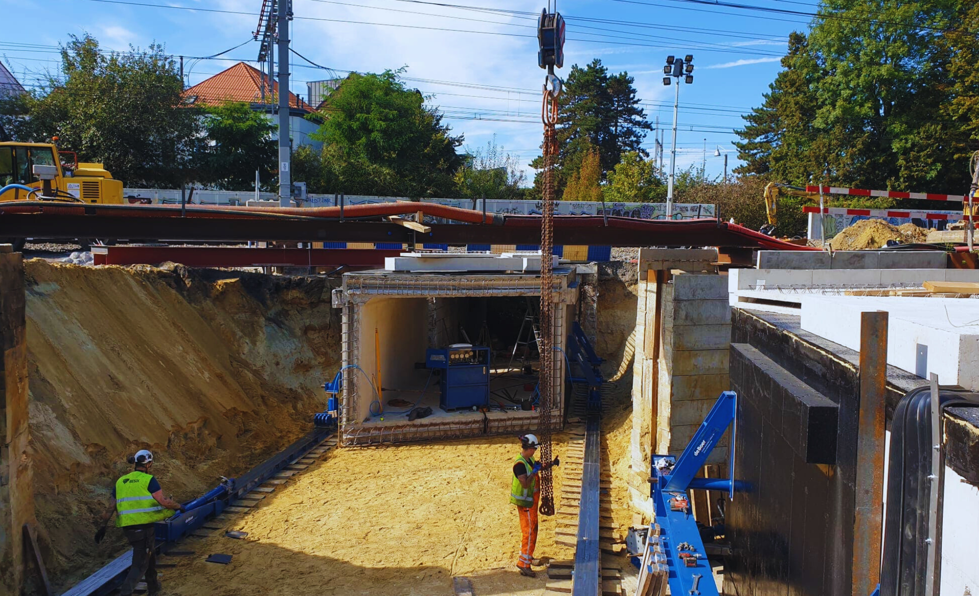Ce passage sous-voies, équipé d’une rampe d’accès, a été construit selon la méthode en strosse. Une dalle massive de 360 tonnes a été mise en place sous les voies en un seul week-end, permettant ensuite de creuser le passage en toute sécurité sous la structure existante.