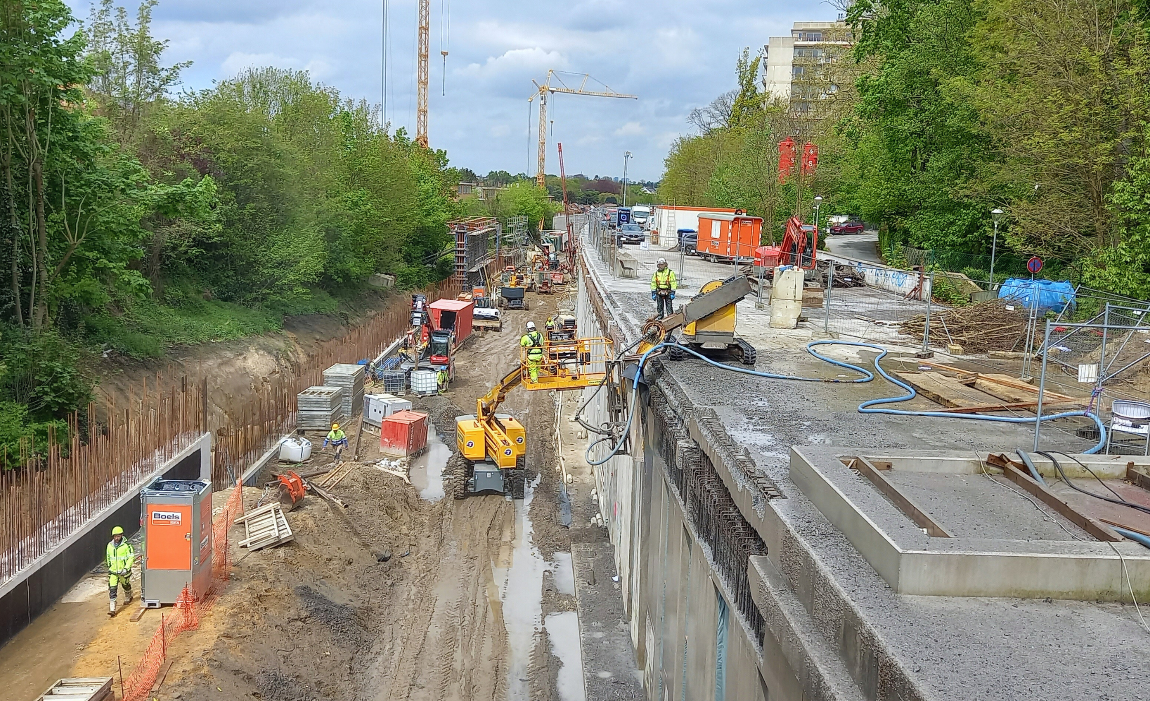 Pour renforcer l’accessibilité à la gare de Watermael, nous avons réalisé un passage sous-voies de 30 mètres et aménagé des rampes d’accès facilitant les déplacements. Les jonctions entre les différents tronçons ont été coulées en place dans l’entrevoie.
